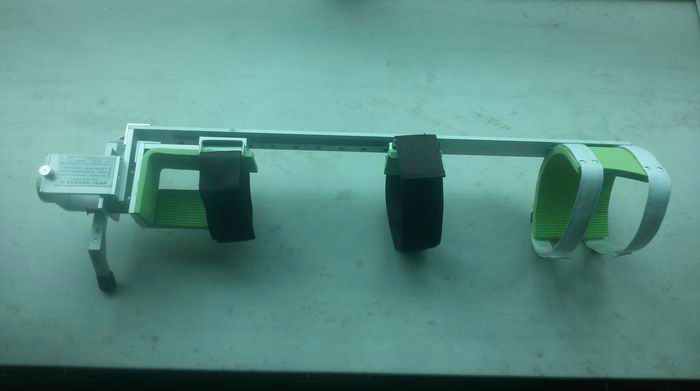 其二、在拉簧的对抗牵引过程中,再调节膑下固定带,用固定带的收紧的方法,把胫腓骨拉向铝合金内侧长板部股骨线,使内侧膝关节间隙增宽,错位的支撑力点回复股骨,膝关节踝关节解剖直线上来,这样内侧半月板予以更好的修复,胫腓韧带结构也更好的得到调正松解。同时缓冲了腘部软组织结构,加速了膝关节腔内外的组织结构血液循环,使无菌性炎性物被血循环带出,达到纠正膝关节外翻及支撑力点。一般膝关节牵引与矫正时间为半小时左右。